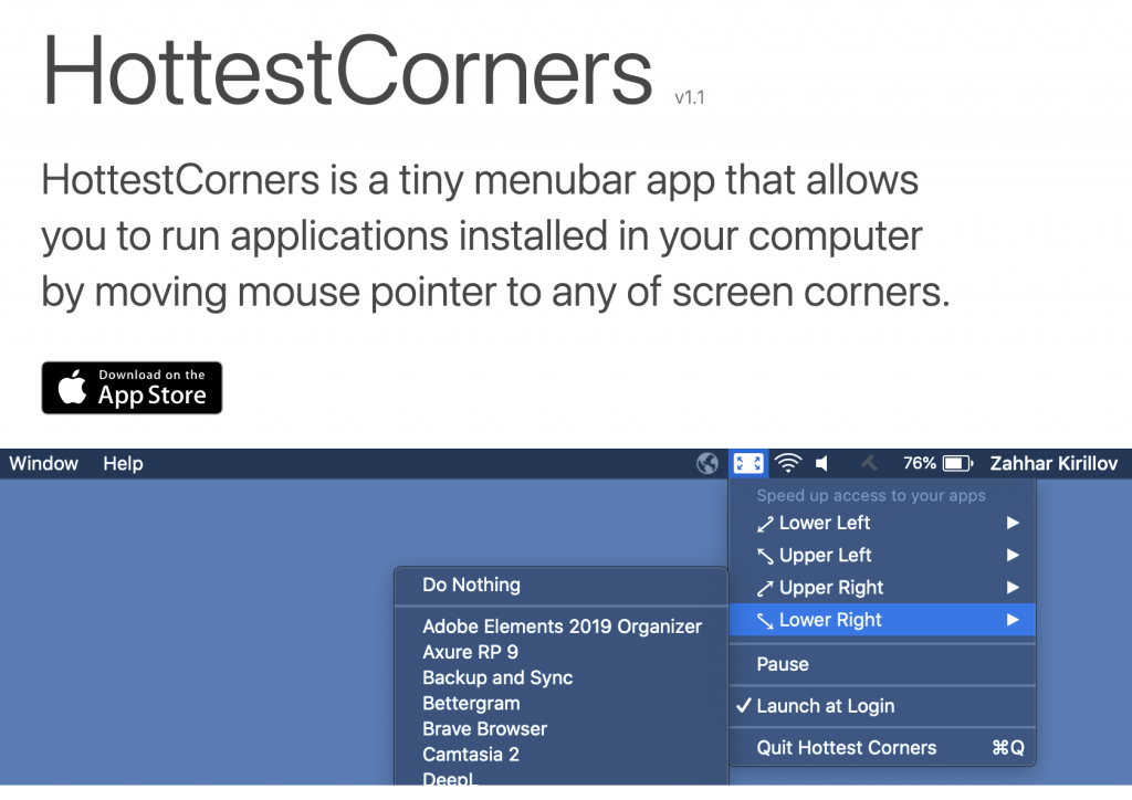 HottestCorners is a tiny menubar app that allows you to run applications installed in your computer by moving mouse pointer to any of screen corners.