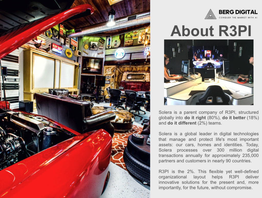 Solera is a parent company of R3PI, structured globally into do it right (80%), do it better (18%) and do it different (2%) teams.